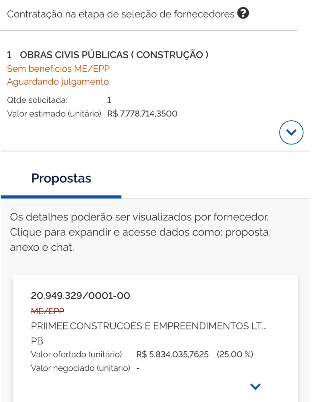 A empresa Priimee Construções e Empreendimentos LTDA ofertou o valor de R$ 5.834.035,76, ficando abaixo do preço máximo estimado, que era de R$ 7.778.714,35. A abertura e divulgação das propostas ocorreu ontem, terça-feira, 20 de janeiro de 2026.
