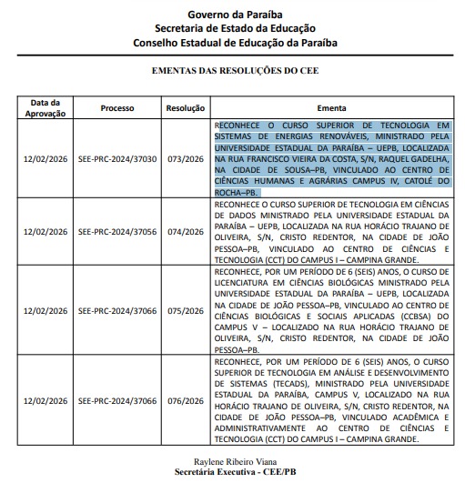 A decisão foi aprovada no dia 12 de fevereiro de 2026, por meio da Resolução nº 073/2026, no âmbito do Conselho Estadual de Educação da Paraíba, e teve sua ementa publicada no Diário Oficial do Estado nesta quinta-feira (18).