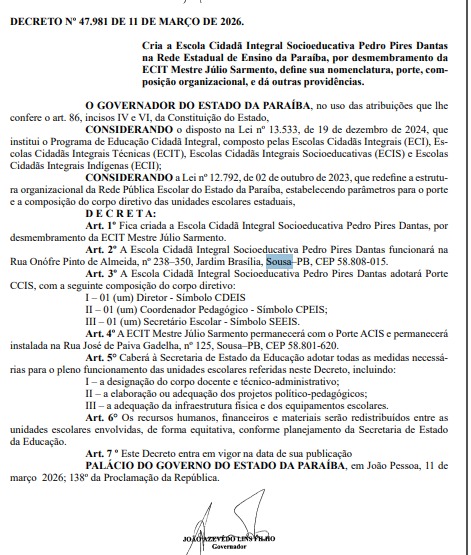O Governo do Estado da Paraíba oficializou a criação de uma nova unidade de ensino na rede estadual em Sousa. A Escola Cidadã Integral Socioeducativa Pedro Pires Dantas foi instituída por meio do Decreto nº 47.981, publicado no Diário Oficial do Estado desta quinta-feira (12). A escola surge a partir do desmembramento da Escola Cidadã Integral Técnica (ECIT) Mestre Júlio Sarmento e funcionará no Centro Educacional do Adolescente (CEA) do município.