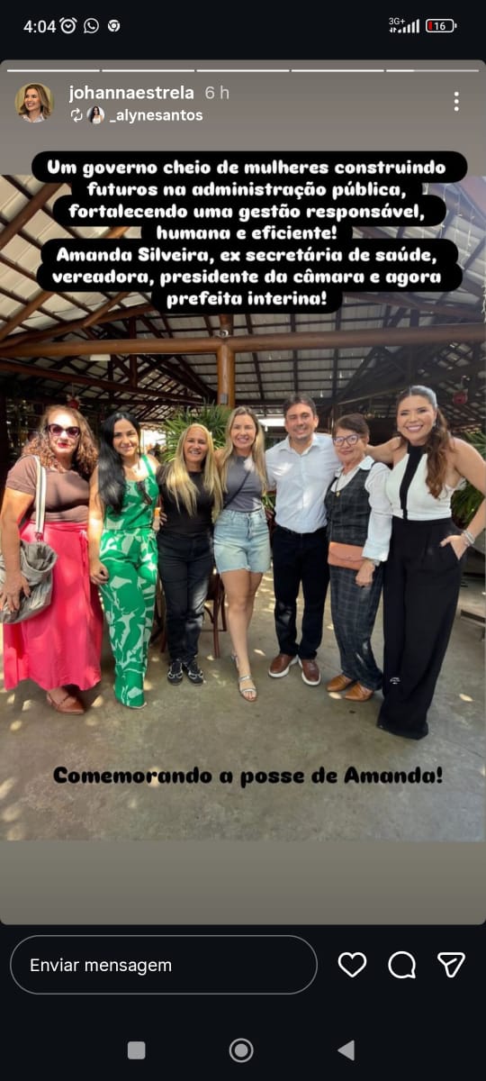Outras imagens que circularam em grupos de WhatsApp reforçam essa leitura. Em uma delas, Johanna aparece abraçada com o primo prefeito Helder, ao lado de Amanda Silveira. A cena contrasta com o discurso oposicionista que marcou parte do primeiro ano mandato da parlamentar em 2025.