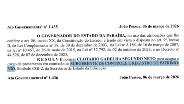 De acordo com o ato, publicado em João Pessoa na sexta-feira (6), Clotário Neto passa a ocupar cargo de provimento em comissão com símbolo CGI-2, vinculado à Secretaria de Estado da Educação da Paraíba.
